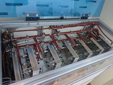 此外,為了排除不同環(huán)境溫度下進(jìn)料溫度的不同對(duì)反應(yīng)的影響,以及針對(duì)某些需要對(duì)反應(yīng)物進(jìn)行預(yù)熱或預(yù)冷的反應(yīng),本設(shè)備還集成了2套彼此獨(dú)立的原料預(yù)熱(冷)系統(tǒng),能夠?qū)⒑懔鞅幂敵龅姆磻?yīng)介質(zhì)在進(jìn)入板式微反應(yīng)單元之前進(jìn)行預(yù)熱或預(yù)冷到設(shè)定溫度,提高了實(shí)驗(yàn)的準(zhǔn)確性和靈活性。